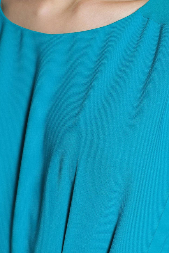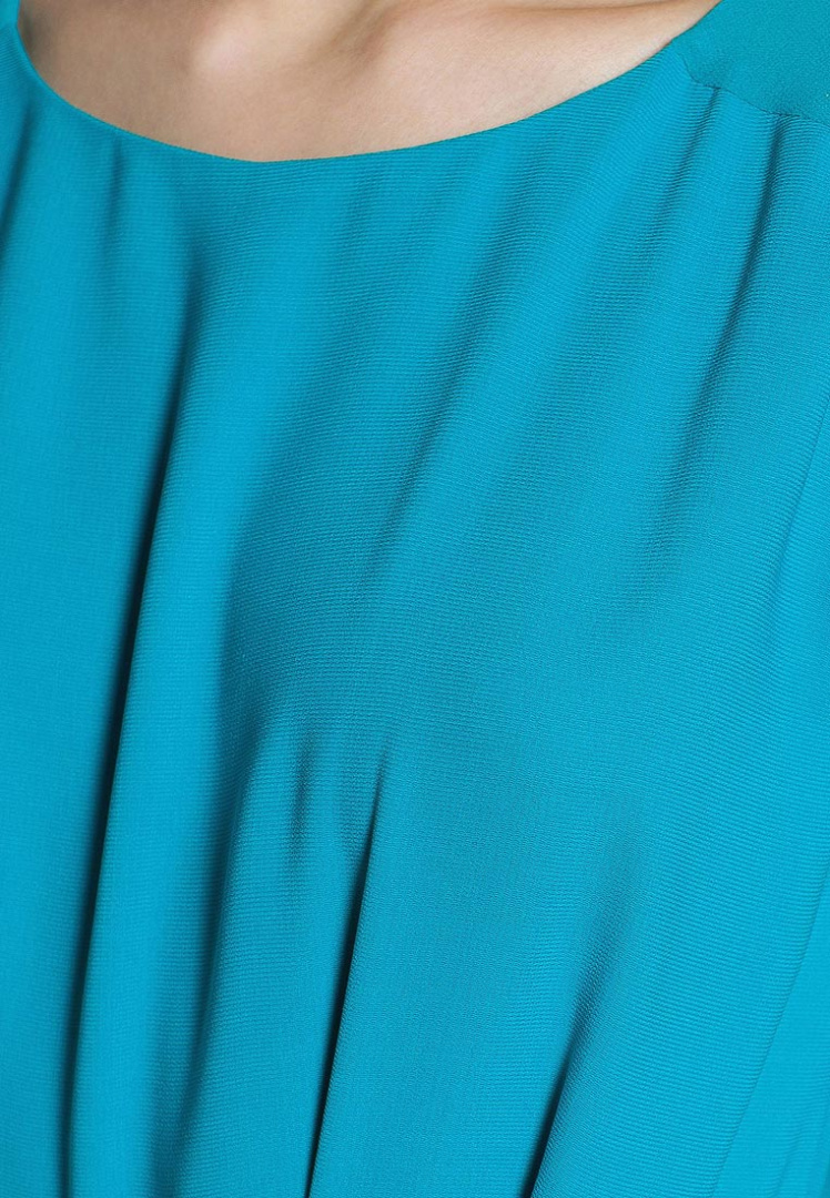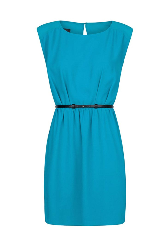 Платье без рукавов, с шифоновой кокеткой, на подкладке. Круглый вырез горловины, эластичная талия, сзади застежка в форме слезы. Имеется узкий ремешок с выделкой под змею